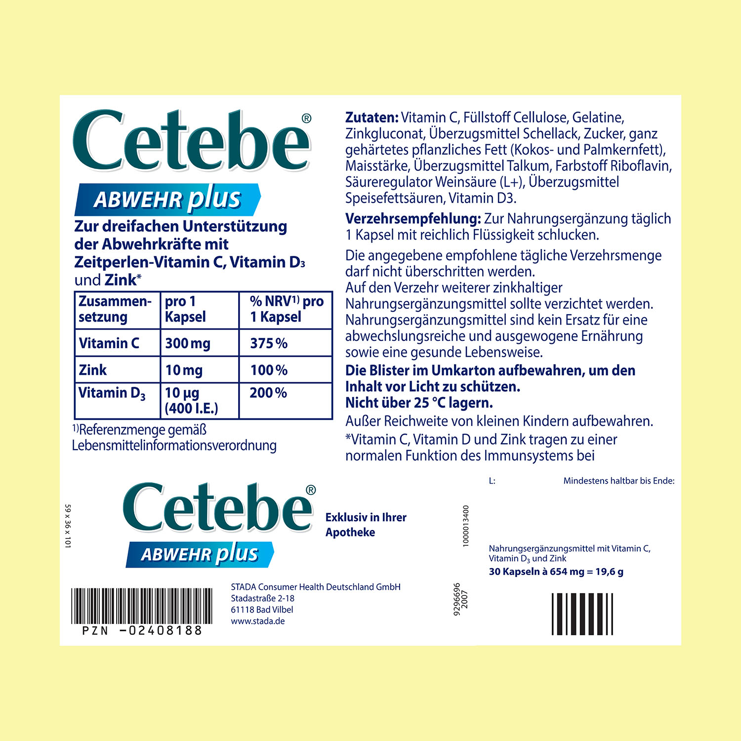Cetebe® ABWEHR plus enthält 300 mg ZEITPERLEN® Vitamin C, 10 μg Vitamin D3 und 10 mg Zink.