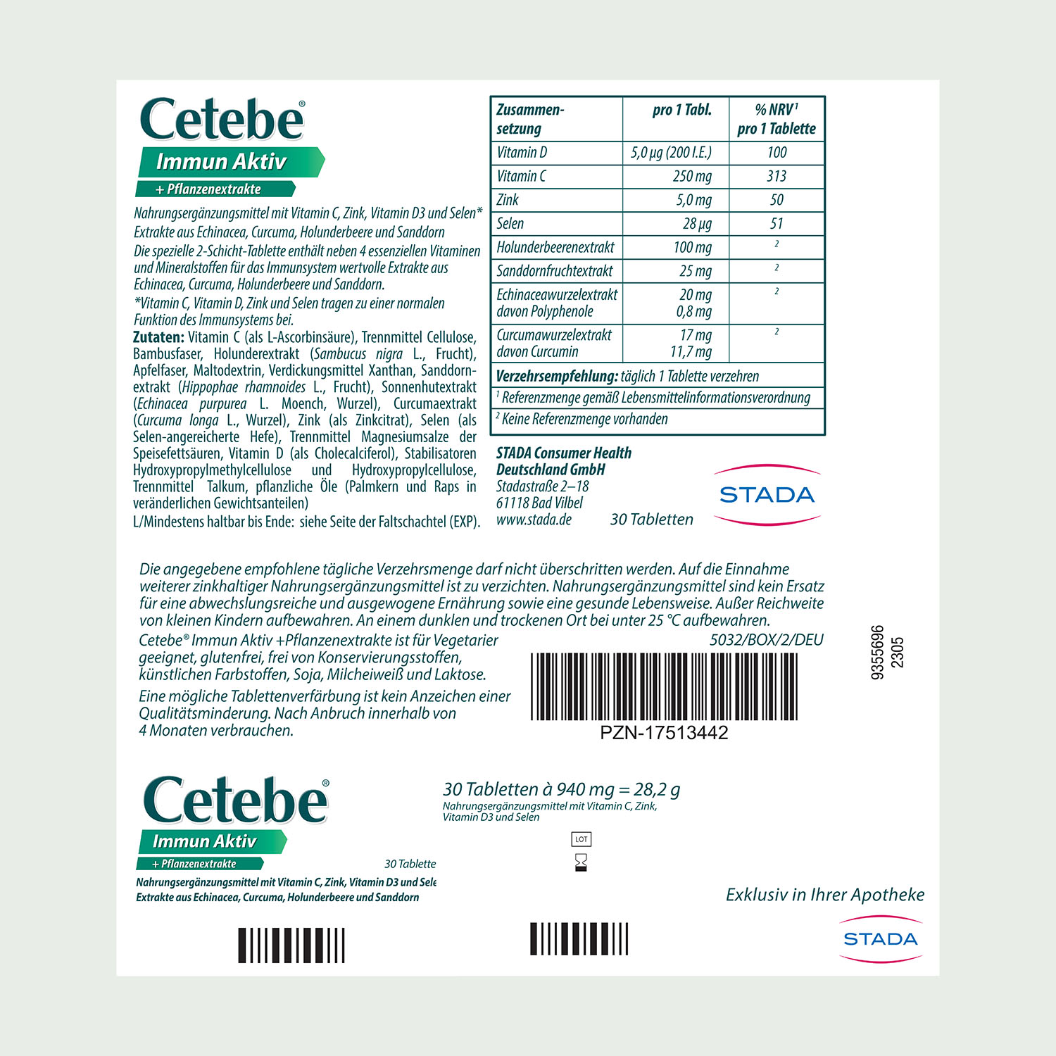 Nach Anbruch der Packung ist Cetebe® Immun Aktiv innerhalb von 4 Monaten zu verbrauchen. An einem dunklen und trockenen Ort bei unter 25 °C aufbewahren.