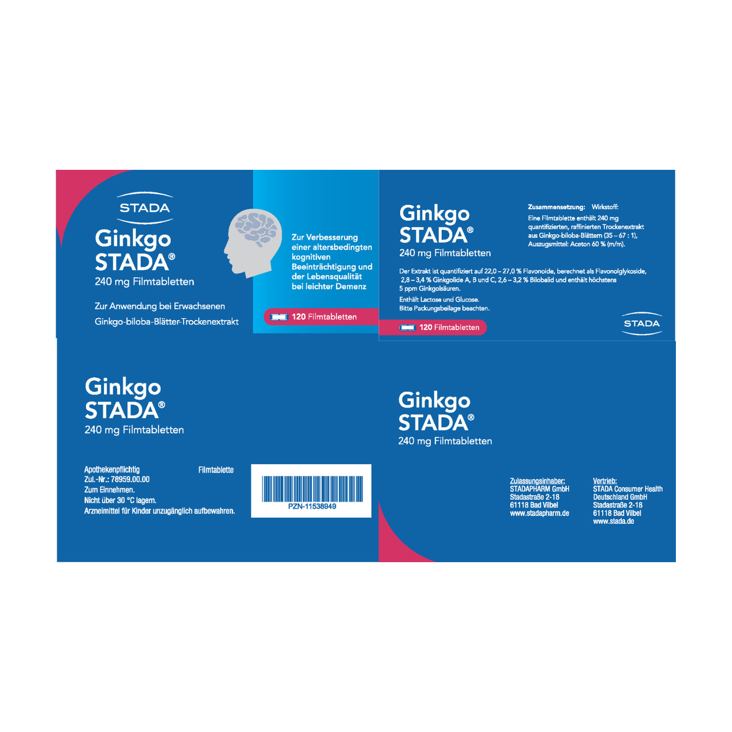 Anwendungsgebiete: Ginkgo STADA® ist ein pflanzliches Arzneimittel zur Verbesserung einer altersbedingten kognitiven Beeinträchtigung und der Lebensqualität bei leichter Demenz. Enthält Lactose und Glucose.
